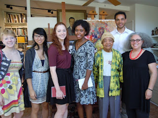 I can’t believe I’m writing this—our Getty internship is more than halfway complete. We were warned during the first week that we would feel this way by Week 5, but I think we’re all still shocked at how quickly the time has passed.And it’s no wonder! We’ve had very busy schedules for the past few weeks. In addition to the trip to Culver City and the Getty Arts Summit I blogged about, we also went to a Surrealism lecture at the Getty Research Institute and a Genji Symposium here at Scripps. We met conservators Aneta Zebala and Hisaji Sekichi. And a couple weeks ago, we spent a day in LA with Samella Lewis and Alison Saar. One of my projects this summer has been to research pieces in the Scripps College Samella Lewis Collection and write about them, so meeting Samella and Alison was especially exciting for me. Alison told us about the projects she’s been working on lately and her experiences with public art projects. She was wonderfully down-to-earth and kind.And talking to Samella Lewis was kind of surreal. Have you ever read so much about someone’s life and work that you started to feel like you knew them? That’s how I was beginning to feel about Samella Lewis. But it turns out there was a lot of information about her that I simply couldn’t have learned from my research. There are so many intimate details that get left out of academic articles and museum catalogues and even transcribed interviews. It’s really impossible to know someone without actually looking them in the face and hearing what they have to say come straight from their own mouth. Samella had lots of personal anecdotes about her life to share with us. She regaled us with stories from her time spent in Bayou Tesch, Louisiana, which is a place that has inspired several of her pieces. (A few of which are in our Permanent Collection.) It was really a treat to here her talk about her work.And today we painted tiles at First Street Gallery. I think McKenzie is going to post about that soon, so I’ll let her tell you about it. When we aren’t busy traveling around and meeting exciting, new people, I’ve been working on planning the fall exhibit for the Clark Humanities Museum at Scripps. It’s going to be a show that features several pieces from our Permanent Collection. I just finished my preliminary checklist and proposal today, but I’ll post more information about the exhibit soon!